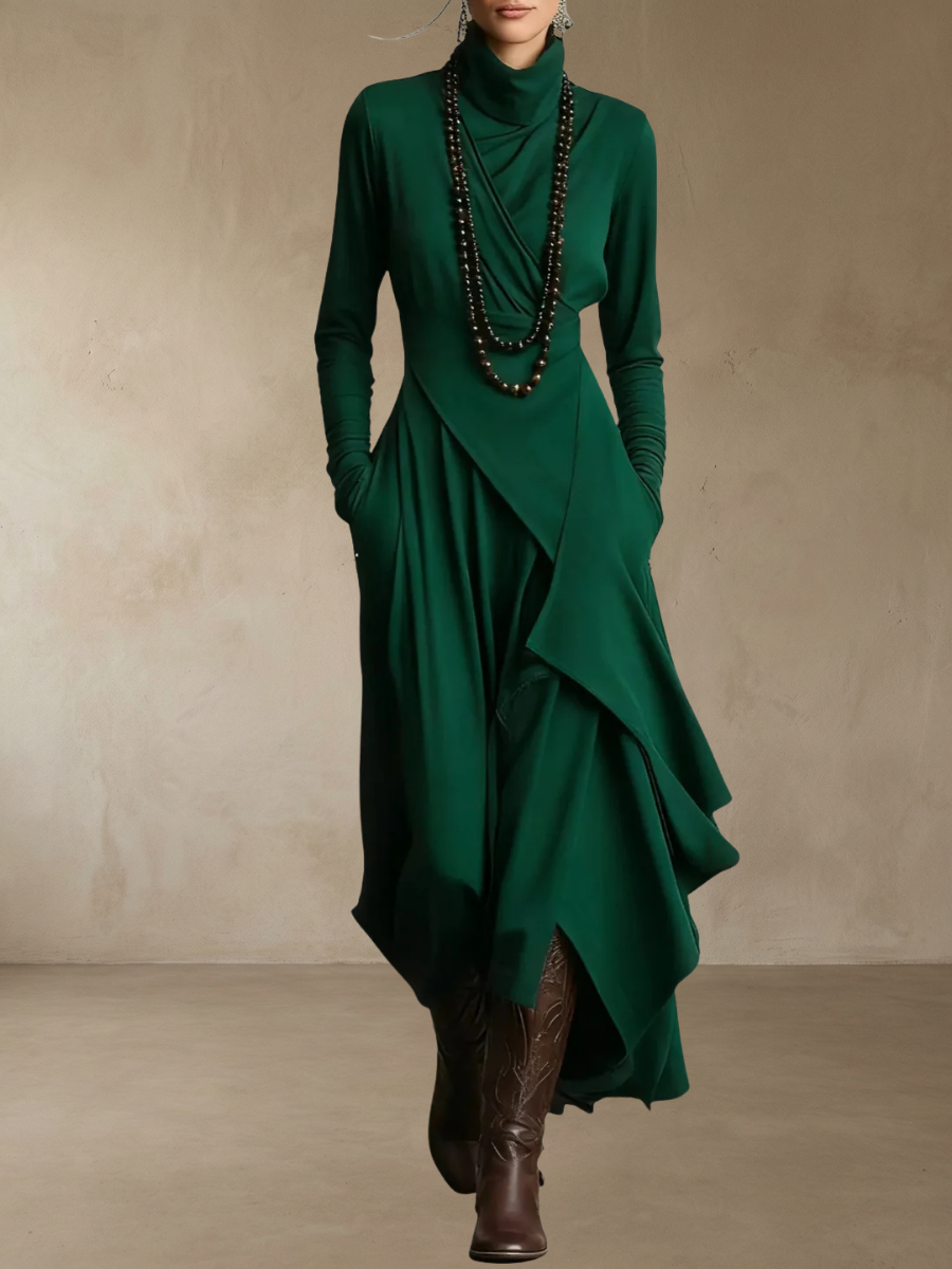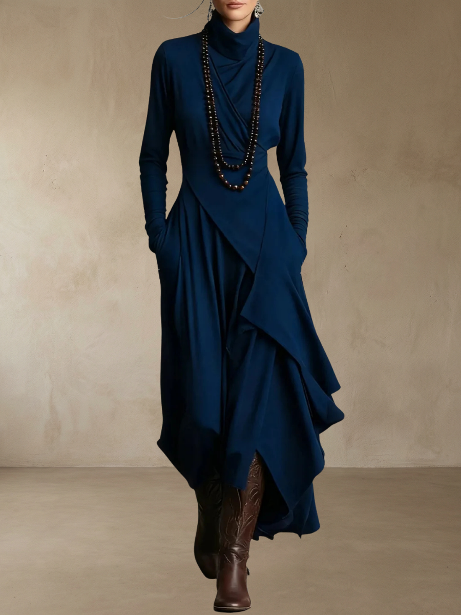 Violet™ – Plisserad maxiklänning är en elegant och avslappnad klänning som kombinerar bohemisk stil med modern komfort. Den mjuka silhuetten, de asymmetriska draperingarna och den höga kragen skapar en unik look som passar perfekt för både vardag och mer uppklädda tillfällen.